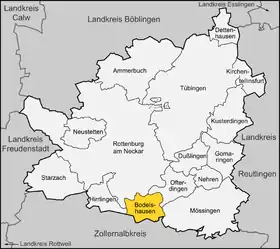 | Localização de Bodelshausen no distrito de Tübingen | |