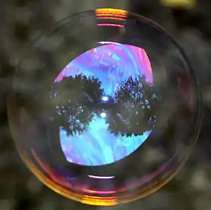 A cor iridescente das bolhas de sabão é efeito da interferência entre as ondas de luz. Quando a luz incide na película, parte dela é refletida para a parte exterior da superfície, enquanto outras partes entram na película e ressurgem depois de refletidas várias vezes por ambas as superfícies. A reflexão total que é observada é determinada pela interferência de todas estas reflexões. Como cada vez que se atravessa a película se produz uma fase proporcional à espessura da película e inversamente proporcional a longitude de onda, o resultado da interferência depende destas duas quantidades. Portanto, para uma determinada espessura, a interferência é construtiva para algumas longitudes de onda e destrutiva para outras, de maneira que a luz branca que incide na película é refletida com uma tonalidade que muda com a espessura.