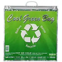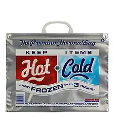 As sacolas de compras térmicas comerciais, para transportar compras sensíveis à temperatura para casa sem quebrar a cadeia de frio, foram introduzidas pela primeira vez em supermercados e outras lojas na Europa em meados da década de 1980. Uma bolsa térmica para manter as pizzas quentes foi inventada por Ingrid Kosar em 1983 e é comumente usada agora.[7][8] Uma caixa térmica é muito semelhante em conceito, mas geralmente maior e na forma de uma caixa rígida.