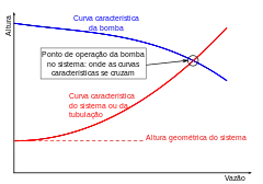 A vazão e a altura manométrica total na qual a bomba centrífuga e o sistema hidráulico encontram o equilíbrio permanente - enquanto a bomba estiver ligada - é o ponto onde a curva da bomba, em azul, intercepta a curva do sistema (em vermelho). Este ponto é denominado ponto de operação.