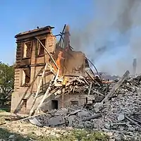Cerca de noventa pessoas estavam abrigadas no porão do prédio no momento do ataque.[2] O prédio foi atingido por um ataque aéreo russo, incendiando o prédio e prendendo uma grande quantidade de pessoas no seu interior.[3]