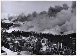 ![]() Bezuidenhout queimando, logo após o bombardeio, fotografado da torre da Igreja de James the Greater, em Parkstraat, Haia. | |||