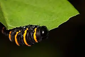 Após o acasalamento, a fêmea põe os ovos, que são de coloração branca, na face inferior das folhas. A larva é negra com anéis amarelos e leva cerca de 30 dias para atingir o estágio adulto.