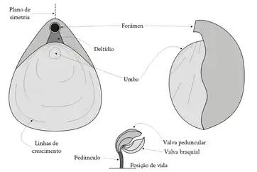 A valva peduncular apresenta uma abertura semi-circular, o forámen, de onde sai um pedúnculo que fixa o animal ao substrato. A valva braquial está associada ao lofóforo, uma estrutura característica do filo, usada na alimentação por filtração. Ambas as valvas podem apresentar linhas de crescimento e ornamentação. As duas valvas se abrem para alimentação e se fecham para proteção.