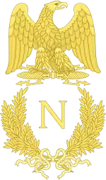 O Emblema não oficial usado durante o Consulado Francês por Napoleão Bonaparte como cônsul-geral durante a Primeira República Francesa, caracterizando uma águia imperial segurando raios de trovão com folhas de oliveira e a letra N no centro. |