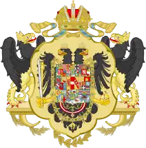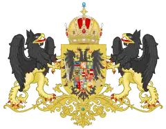As duas cabeças da águia coroadas com as habituais coroas reais heráldicas, fechadas com oito diademas (cinco à vista). O águia sustentava em sua garra direita uma espada e o cetro da Áustria e com a esquerda a orbe do mundo.