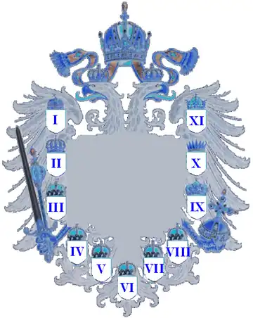 ![]() ![]() | II III IV V VI VII VIII IX X XI XII XIII XIV XV XVI XVII XVIII XIX XX | Reino de Galícia e Lodoméria Reino da Boêmia Reino da Dalmácia Ducado da Silésia Ducado de Salzburgo Margraviato da Moravia Ducado de Tirol Ducado da Bucovina Estado de Vorarlberg Margraviato de Ístria Condado de Gorizia Condado de Gradisca Província da Bósnia e Herzegovina Cidade Livre de Trieste Arquiducado da Baixa Áustria Arquiducado de Alta Áustria Ducado da Estíria Ducado da Carniola Ducado da Caríntia Arquiducado da Áustria |
