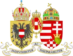 Na parte central figurou um terceiro escudo, de pequeno tamanho, com os brasões próprios da dinastia (Habsburgo, Áustria e Lorena). Este pequeno escudo encontrava-se timbrado com uma Coroa Real e rodeado do colar da Ordem do Tosão de Ouro. Embaixo deste escudo central também apareciam representados a banda da Ordem Militar de Maria Teresa e os colares das ordens de São Estêvão e de Leopoldo. Na parte inferior podia ler-se o lema "INDIVISIBILITER AC INSEPARABILITER" ("Indivisíveis e Inseparáveis"). Existiram outras versões simplificadas na que não apareciam representadas as figuras dos suportes e os brasões dos dois focos se reduziam às armas dos escudos, o brasão austríaco (sobre o peito do águia bicéfala) e o húngaro (com as armas de Croácia na ponta).
