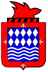 | Escudo | Escudo neo-clássico de prata, partido. No chefe, em abismo, brasão anterior do município ladeado por duas âncoras de ouro. Na ponta, campo ondulado de blau e prata. |