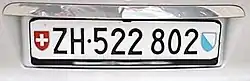 Placa de veículo, com o brasão de armas da Suíça, à esquerda, e o brasão de armas de Zurique, à direita.