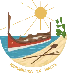 Este brasão de armas foi adoptado em 11 de Julho de 1975, um ano após Malta se tornar numa república. Ele mostra uma cena costeira com o Sol Nascente, um tradicional barco maltês (o 'Luzzu'), uma pá e um forcado, e um Opuntia. Abaixo da imagem, em seguida, o novo nome do Estado REPUBBLIKA TA' MALTA (República de Malta), foi inscrito.