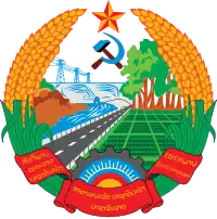 O brasão de armas do Laos mostra o santuário nacional Pha That Luang. Além disso, a barragem aparece como um símbolo de energia no reservatório Nam Ngun, um asfalto de rua aparece, e uma versão estilizada de um campo de rega está representado. Na parte inferior de uma secção está uma roda de engrenagem. As duas inscrições, à esquerda e à direita, a inscrição "Paz, Independência, Democracia" (em laociano: ສ ັ ນ ຕ ິ ພ າ ບ ເ ອ ກ ະ ລ າ ດ ປ ະ ຊ າ ທ ິ ປ ະ ໄ ຕ) e à direita "Unidade e Prosperidade" (em laociano: ເ ອ ກ ະ ພ າ ບ ວ ັ ດ ຖ ະ ນ າ ຖ າ ວ ອ ນ.)