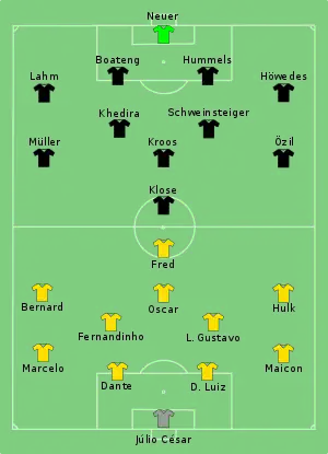 O zagueiro e capitão do Brasil Thiago Silva estava suspenso das semifinais devido ao acúmulo de cartões amarelos,[34] apesar de um apelo contra a suspensão por parte da Confederação Brasileira de Futebol.[35] O atacante Neymar também não estava disponível para a partida, após ter sofrido uma entrada do lateral colombiano Zúñiga nas quartas-de-final, acertando com o joelho direito na parte inferior das costas do atleta, ocasionando uma fratura na terceira vértebra lombar do atacante brasileiro, e o obrigando a estar ausente do restante da competição.[36][37] Dante e Bernard foram escolhidos para substituírem Thiago Silva e Neymar, respectivamente, com Luiz Gustavo substituindo Paulinho no meio-campo defensivo.[38] A Alemanha permaneceu inalterada em relação às quartas de final.[39] O goleiro Júlio César e o capitão David Luiz prestaram homenagem a Neymar segurando sua camisa durante a cerimônia do hino nacional.[40] Mesmo com as ausências, os analistas esperavam uma partida equilibrada, pontuando que a torcida do Brasil em casa poderia oferecer alguma vantagem.[41]
