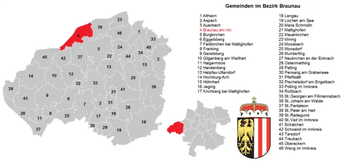 Braunau am Inn possui 46 municípios, 3 deles com estatuto de cidade (Stadtgemeinde) e 5 com estatuto de mercado (Marketgemeinde):