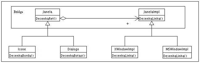 O diagrama mostra a solução para o problema citado. Temos duas hierarquias de classes relacionadas: a hierarquia de tipos de janelas (Janela, Ícone e Dialogo) e a de implementação nas plataformas suportadas (JanelaImpl, XWindowImpl e MSWindowImpl). O relacionamento entre as interfaces, Janela e JanelaImpl, é a "ponte" que "desacopla" a interface da implementação. Para que um ícone seja desenhado, faz-se uma chamada ao método DesenhaBorda() que por sua vez realiza "n" chamadas ao método DesenhaLinha() da classe XWindowImpl ou MSWindowImpl, dependendo da plataforma desejada.