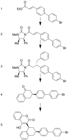 Brodifacoum é um derivado do grupo 4-hidroxicumarina. Os números dos compostos são encontrados ao lado de seus respectivos compostos na imagem abaixo. O composto 1 é o éster de partida necessário para sintetizar o brodifacoum. Para obter este composto 1 de partida, é realizada uma simples condensação Wittig de cloroacetato de etilo com 4'-bromobifenilcarboxaldeído. O composto 1 é transformado no composto 2 por hidrólise consecutiva, halogenação para formar um cloreto de ácido e então reagido com o ânion de lítio necessário. Isso é feito usando KOH e EtOH para hidrólise e, em seguida, adicionando SOCl 2 para cloração para formar o cloreto de ácido que reage com a adição de ânion de lítio. O composto 2 é então transformado usando química de organocobre para produzir o composto 3 com boa estereosseletividade de cerca de 98%. Normalmente, uma ciclização do tipo Friedel-Crafts seria então usada para obter a porção do sistema de dois anéis do composto 4, mas isso resulta em baixo rendimento. Em vez disso, o ácido trifluorometanossulfônico em benzeno seco catalisa a ciclização com bom rendimento. A cetona é então reduzida com borohidreto de sódio produzindo um álcool benzílico . A condensação com 4-hidroxicumarina sob HCl produz o composto 5, brodifacoum.[4]
