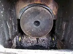 Bronzina em uma locomotiva S-Motor 1906 mostrando o eixo, rolamento, suprimento de óleo e almofada de óleo
