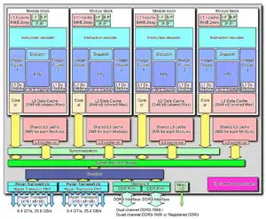- Um módulo consiste em um acoplamento de dois núcleos de processamento x86 "convencionais" fora de ordem. O núcleo de processamento compartilha os estágios iniciais do pipeline (por exemplo, L1i, busca, decodificação), as FPUs e o cache L2 com o restante do módulo.