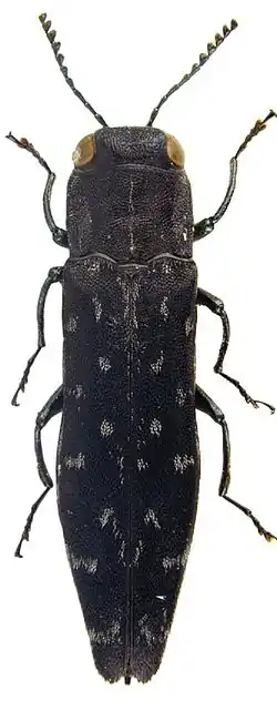 ![]() Euchroma gigantea, conhecida em todo o Brasil neotropical e denominada mãe-do-sol; chegando a superar os 9 centímetros de comprimento; utilizada pelos indígenas para a confecção de ornamentos corporais[6][7]; podendo provocar uma modificação significativa na arborização urbana em consequência da sua alta capacidade de reprodução e à voracidade das suas larvas, causando prejuízos diretos na própria planta e indiretos, resultantes dos danos causados pela queda de árvores sobre edificações, veículos, redes elétrica e telefônica e colocando em risco a segurança de pessoas e animais.[8] Seus élitros possuem brilhos avermelhados e da cor do cobre.[9] ![]() Agrilus ambiguus, cujo holótipo fora encontrado no Sikkim, Índia.[10] Este gênero possui diversas espécies sul-americanas[11] e também contém a espécie Agrilus planipennis, designada, em Portugal, como broca-do-freixo: Fraxinus excelsior.[12] ![]() Este Buprestidae africano da espécie Julodis cirrosa foi fotografado no Cabo Setentrional da África do Sul. Algumas espécies desta família apresentam uma pilosidade mais ou menos densa sobre seus corpos, ou são recobertas por um pó muito fino (induto céreo).[6] ![]() Polybothris auriventris, vista superior (esquerda) e inferior (direita); espécime de Madagáscar, África. Não é comum, entre os besouros Buprestidae, a forma corporal arredondada. | |||||||||||||||||