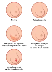 | Sintomas | Nódulo numa mama, alterações na forma da mama, retração da pele, líquido no mamilo, pele vermelha e escamosa[1] |