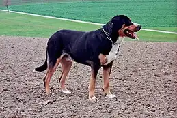 Um cão adulto da raça Grande Boiadeiro Suíço. Uma raça tradicionalmente utilizada para tração.