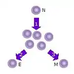 2. Alguns dos clones de células T diferenciam-se em células T efectoras (E) que realizarão a função da célula (por exemplo, produzem citocinas no caso das células T colaboradoras ou uma actividade citotóxica no caso das células T citotóxicas).