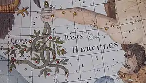A cauda da constelação de Cérbero estava em Fornax (representado[3] como um aparelho químico[4]). Aparentemente, o "ramo dourado" em que a serpente Cérbero se enrosca, o "ramo da árvore das maçãs de ouro" buscada pelo titã Atlas do Jardim das Hespérides[5] foi considerado como tendo sido gerado por meio da alquimia. O tal ramo dourado era conhecido como a constelação de Ramus Pomifer.