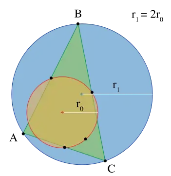 - O raio de uma circunferência circunscrita em um triângulo é duas vezes o raio do círculo de nove pontos desse triângulo.[5]:p.153