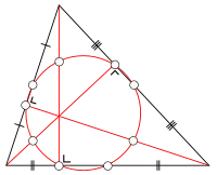 - [...] o círculo que passa através dos pés das alturas de um triângulo é tangente a todos os quatro círculos, que por sua vez são tangentes aos três lados do triângulo [...] (Feuerbach 1822)