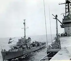 ![]() CTE Baependi (D-17) sendo abastecido em alto-mar pelo NAeL Minas Gerais (A-11). | |