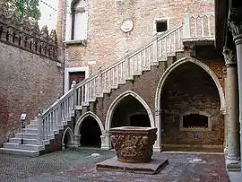 Internamente, o edifício tem uma planta em forma de C articulada em torno dum pátio descoberto, ao centro do qual está posicionada um grande muro de poço em mármore broccatello de Verona, realizada por Bartolomeo Bon em 1427. O artista esculpiu em três dos lados desta protecção, entre ricas folhagens, as alegorias femininas da Justiça, da Força e da Caridade.