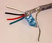 Um cabo blindado é um cabo elétrico que possui uma camada condutora comum em torno de seus condutores para blindagem eletromagnética.[1] Essa blindagem geralmente é coberta por uma camada mais externa do cabo. Tipos comuns de blindagem de cabo podem ser categorizados mais amplamente como tipo folha (doravante: filme metalizado), fios de fio contra-espiral (trançado ou não trançado) ou ambos.[2] Um fio longitudinal pode ser necessário com lâminas espirais dielétricas para curto-circuitar cada volta.[1]