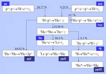 A partir deste ponto a reação se subdivide em três ramos diferentes que desembocam todas na geração de um núcleo 4He. Na pp1 o hélio-4 se produz pela fusão de dois núcleos de hélio-3; os outros dois ramos, pp2 e pp3 requerem o hélio-4 previamente produzido na pp1, ambas cadeias surgem dos dois caminhos que o berílio-7 pode tomar.