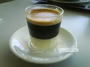 É servido num cálice de vidro transparente, com o objetivo de mostrar as camadas de café e leite condensado. As densidades diferentes dos líquidos deixam o café na parte superior e o leite condensado na parte inferior. Geralmente é servido em um copo de vidro transparente para mostrar as camadas de café e leite. A densidade diferente dos líquidos faz com que o café fique no topo, enquanto o leite condensado fica no fundo.