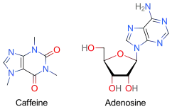 Na ausência de cafeína e quando uma pessoa está acordada e alerta, uma pequena quantidade de adenosina está presente nos neurônios (SNC). Com o estado contínuo de despertar, ao longo do tempo, a adenosina se acumula na sinapse neuronal, por sua vez, vinculando e ativando os receptores de adenosina encontrados em certos neurônios do sistema nervoso central (SNC); Quando ativados, esses receptores produzem uma resposta celular que, finalmente, aumenta a sonolência. Quando a cafeína é consumida, ela antagoniza (bloqueia) os receptores de adenosina; Em outras palavras, a cafeína impede a adenosina de ativar o receptor ao bloquear a localização no receptor onde a adenosina se liga a ela. Como resultado, a cafeína impede temporariamente ou alivia a sonolência e, portanto, mantém ou restaura o estado de alerta[20]