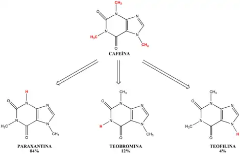 A cafeína é metabolizada no fígado pelo sistema enzimático do citocromo P450 oxidase, em particular, pela isoenzima CYP1A2, em três dimetilxantinas, cada uma das quais tem seus próprios efeitos no corpo: