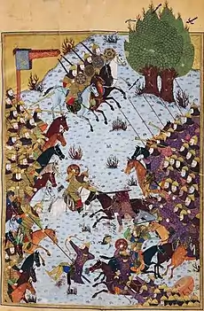 As batalhas finais com Afrassíabe são alimentadas pela vingança por Seoses. Em Tabari, onde Caicaus torna Caicosroes rei uma vez que foi levado à Pérsia, o tema da vingança é incorporado no discurso obrigatório de sua entronização, e as batalhas ocorrem depois que se torna rei, enquanto em Taalebi e na Épica, as batalhas são travadas enquanto Caicaus ainda era rei, e Caicosroes tornar-se-ia rei apenas após a morte de seu avô. A narrativa de Tabari do primeiro embate com Afrassíabe envolve Tus, filho de Noudar, que foi enviado com outros guerreiros, incluindo Judarz (Godarz) e Burzafera (zrʾfh em ibne de Bactro), outro filho de Caicaus, mas, contra as ordens de Caicosroes, mata Forude, outro filho de Seoses (Siāvaḵš) e meio-irmão do rei. Tus foi acorrentado e algemado e enviado com mensageiros ao rei, mas Afrassíabe envia guerreiros para interceptá-los, entre eles Firane, filho de Visague. Uma batalha se segue, cuja existência não é mais citada. Na Épica, Forude é filho de Jarira, filha de Pirane, ou um dos filhos de Visa, como aparece em outras fontes.[1]
