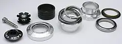 Partes de uma caixa de direção sem rosca, antes da instalação.