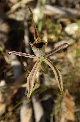 São plantas com uma única folha basal pubescente com marcas proeminentes púrpura perto da base, e uma inflorescência rija, fina e densamente pubescente, com uma ou poucas flores, que vagamente lembram uma aranha, muito estreitas, caudadas, e bem esparramadas, normalmente pendentes. Em conjunto formam grupo bem vistoso quando sua floração é estimulada por incêndios de verão.[2]