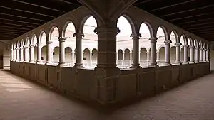 Uma das suas estruturas mais importantes é o claustro, com um plano quadrado e dividido em dois pisos sobrepostos. O inferior é composto de arcos semicirculares, que descansam em pilares com pilastras orais e ornamentais anexadas. O fechamento desta é resolvido com abóbadas com nervuras. Os mais belos quartos monásticos estão localizados no piso térreo destacando o "Salão dos Capítulos ou Piñas" por apresentar as chaves dos nervos de seus cofres decorados com florons. Como decoração do conjunto, escudos santiaguistas e emblemas heráldicos são esculpidos.