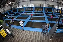 Estes parques comerciais estão localizados em ambientes fechados e possuem camas elásticas de parede a parede para impedir que as pessoas caiam em superfícies duras. Paredes acolchoadas ou com molas protegem as pessoas de ferimentos causados por impacto. Apesar dessas precauções, houve pelo menos uma morte registrada devido a um primeiro desembarque em um parque de camas elásticas.[18] Em março de 2012, o arremessador do New York Yankees Joba Chamberlain machucou gravemente o tornozelo enquanto pulava em um centro comercial de salto em Tampa com seu filho.[19] Em 2018, um homem morreu em um parque de camas elásticas da Colúmbia Britânica, o que levou a pedidos de mais regulamentos de segurança para essas atividades populares.[20]