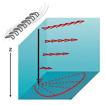A camada de Ekman é a camada de fluido em que o fluxo é o resultado de um equilíbrio entre o gradiente de pressão, as forças de Coriolis e de arrasto turbulento. Na foto acima, o vento soprando do Norte cria uma tensão de superfície e uma espiral de Ekman resultante é encontrada abaixo dela na coluna de água.