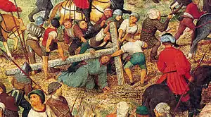 Nos detalhes, em Galeria, a pintura de Bruegel possui uma vivacidade que parece vir da sua observação da vida contemporânea.[5] As execuções públicas eram uma característica habitual da vida do século XVI, especialmente na problemática Flandres. Bruegel mostra os dois ladrões que estavam para ser supliciados ao lado de Cristo a serem levados para o local da execução. Anacronicamente, ambos seguram crucifixos e estão a fazer a confissão final a sacerdotes encapuzados. Os ladrões, os confessores e os espectadores macabros que cercam a carroça estão com vestimentas contemporâneas do pintor. Na época de Bruegel, as execuções públicas eram acontecimentos muito concorridos que tinham o ar de festivais ou de carnavais. Neste caso, Bruegel mostra a absoluta indiferença das multidões embasbacadas ao medo e à angústia dos condenados. (Também mostra os carteiristas e os feirantes que se imiscuem nas multidões em tais ajuntamentos). É de salientar que Bruegel não faz distinção entre os dois ladrões, um dos quais iria ser abençoado por Cristo.