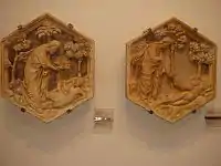 Nos relevos do lado oeste do campanário é possível observar uma curiosa originalidade no tratamento de temas que, em outros lugares, seguem um rígido apego a formas pré-estabelecidas: falta a narração da tentação e da expulsão dos progenitores, privilegiando, em vez disso, o trabalho nos campos; na embriaguez de Noé,[9] faltam os filhos que o observam ou tentam cobrir sua nudez, e toda a atenção se volta para a magnífíca videira, sob a qual repousa um barril realizado com cura. O objetivo então é de sintetizar a história bíblica e a representação da criatividade humana.