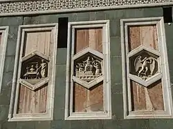 Na parte de cima, nos losangos, os Sete Sacramentos (Batismo, Confissão, Casamento, Ordem Sacerdotal, Crisma, Eucaristia e Unção dos Enfermos) atribuídos a Alberto Arnoldi ou Maso di Banco; na parte superior do antigo portal de coligação com a catedral, tem a Madonna col Bambino de Andrea Pisano.