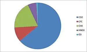 A emissão de dióxido de carbono (CO2) cresce 5 bilhões de toneladas por ano devido à queima de conbustíveis fósseis. O dióxido de enxofre (SO2),também provinda da queima de combustíveis fósseis chega a 200 milhões do toneladas por ano. Em combinação com o dióxido de azoto (NO2), este gás provoca a chuva ácida. Os processos de fertilização e o uso de defensivos agrícolas são os principais responsáveis pela emissão de óxido nitroso (N2O), que é o gás que causa mais danos à camada de ozônio. Sessenta por cento da emissão de gás metano (CH4) é provocada por atividades humanas, como cultivo agrícola, a pecuária e lagos artificiais de grandes hidrelétricas. Já o CFC não é mais produzido, mas os efeitos de emissões acumuladas durarão um século.