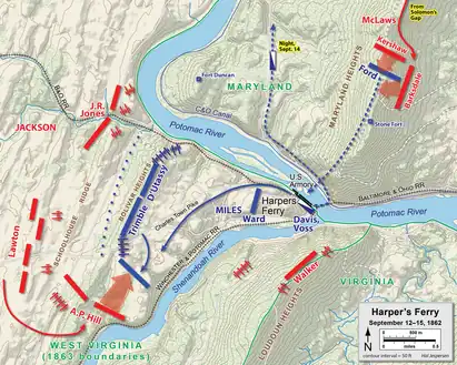 Conforme as três colunas de Jackson se aproximavam de Harpers Ferry, o coronel Dixon S. Miles, comandante da guarnição, insistiu em manter a maioria das tropas perto da cidade em vez de assumir posições de comando nas colinas circundantes. Os Carolinianos do Sul sob o brigadeiro-general Joseph B. Kershaw encontrou as defesas de Maryland Heights, mas apenas uma breve escaramuça se seguiu. Fortes ataques das brigadas de Kershaw e William Barksdale em 13 de setembro expulsaram as tropas da União, em sua maioria inexperientes, das alturas.[27]