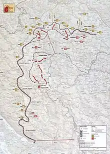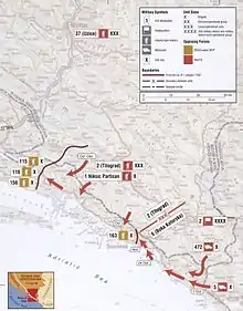 O Corpo de exército de Banja Luka foi encarregado do eixo principal de avanço de Okučani a Daruvar e Virovitica, no oeste da Eslavônia, e de um avanço secundário de Okučani em direção a Kutina. [46] Esta tarefa era consistente com a linha que se esperava que o impulso principal do JNA avançasse do leste em cerca de uma semana. [47] O Corpo já havia implantado um grupo de batalha da 265ª Brigada Mecanizada perto de Okučani para apoiar o avanço que começou em 21 de setembro e alcançou as Montanhas Papuk. O Corpo recebeu duas brigadas motorizadas e uma brigada de artilharia como reforços durante o avanço, mas os problemas de moral e deserções vividos no leste da Eslavônia também estiveram presentes no Corpo de Banja Luka. Num desses casos, a 130ª Brigada Mecanizada, enviada como reforço, foi reduzida a um batalhão de 280 homens em 29 de setembro. [48] O JNA foi detido pelo ZNG entre Novska, Nova Gradiška e Pakrac, embora algumas unidades da milícia croata sérvia tenham assumido posições em Bilogora e Papuk ao norte de Pakrac, perto de Virovitica, e em Slatina, sem apoio do JNA. [49]