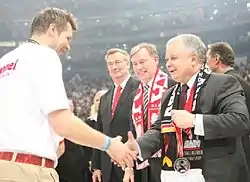 Lech Kaczyński, presidente daPolônia, entrega a medalha de prata a Bogdan Wenta, treinador da Seleção da Polônia.