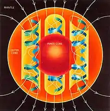 A Terra e a maioria dos planetas do Sistema Solar, assim como o Sol e outras estrelas, geram campos magnéticos através do movimento de fluidos eletricamente condutores.[48] O campo da Terra se origina em seu núcleo. Esta é uma região de ligas de ferro que se estende a cerca de 3 400 km (o raio da Terra é 6370 km). É dividido em um núcleo interno sólido, com um raio de 1 220 km, e um núcleo externo líquido.[49] O movimento do líquido no núcleo externo é impulsionado pelo fluxo de calor do núcleo interno, que é de cerca de 6 000 K (ou 5 730 ºC), até a fronteira núcleo-manto, que é de cerca de 3 800 K (ou 3 530 ºC).[50] O calor é gerado pela energia potencial liberada pelos materiais mais pesados que afundam em direção ao núcleo (diferenciação planetária), bem como pelo decaimento dos elementos radioativos no interior. O padrão de fluxo é organizado pela rotação da Terra e pela presença do núcleo interno sólido do planeta.[51]